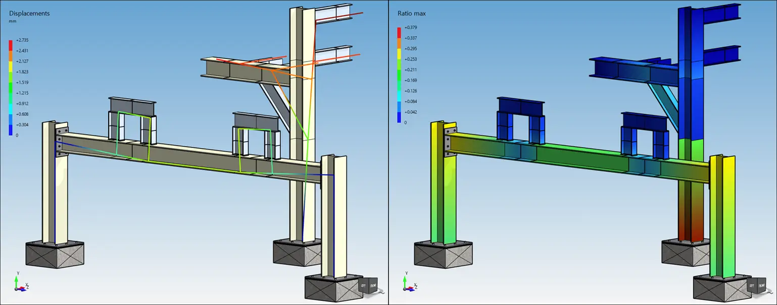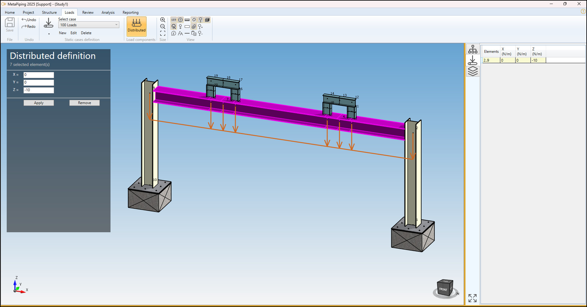 - Static loads: operating weight, thermal expansion, snow and wind, variable pseudo-static acceleration, applied support movements, distributed forces, nodal forces and moments.
