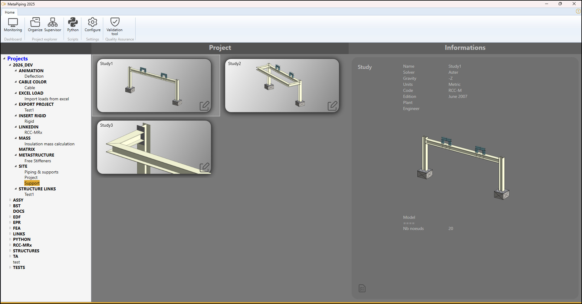 A study contains a 3D model and can be a piping system or a structure. So all supports of a piping can be stored in the same project for example. Smart!